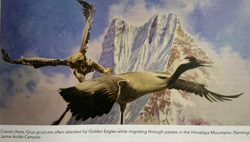 Vue d’artiste d’une attaque d’aigle royal sur une grue au dessus de l’Himalaya.